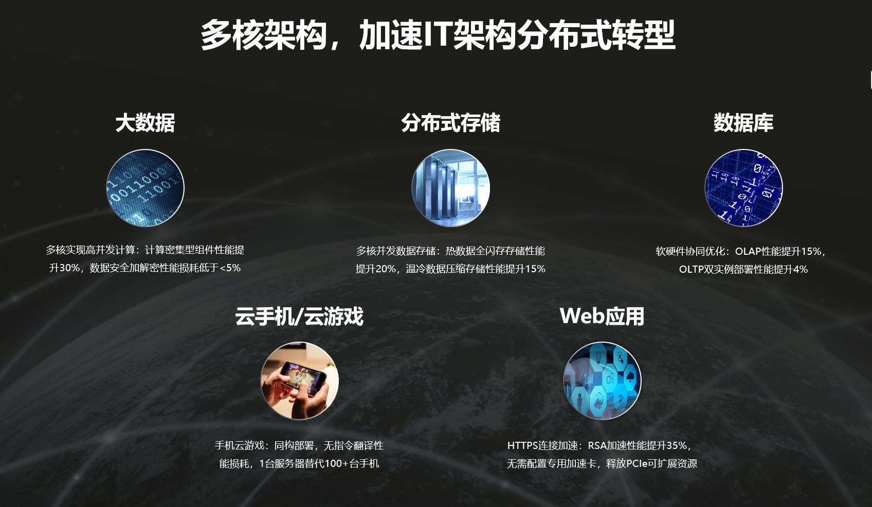 比如在大数据的应用中,多核实现高并发计算,计算密集型组件性能提升30%,数据安全加解密性能损耗低于5%。从存储端的应用来看,多核并发数据存诸,多核并发数据存储,热数据全闪存存储IOPS性能提升20%,温冷数据压缩存储性能提升15%。在数据库端的应用,通过软硬件协同优化,OLAP性能提升20%,OLTP双实例部署性能提升4%。在手机云游戏上,云手机/云游戏场景,同构部署,无指令翻译性能损耗40%性能优势,1台服务器替代80台手机。Web应用:HTTPS连接加速,RSA加速性能提升35%,无需配置专用加速卡。