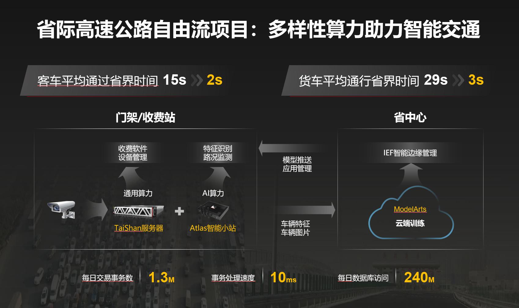 华为协助交通部门对系统进行改造,通过服务器的边缘处理能力让数据在“端”直接完成,大大缩减了与数据中心交互的时间,使得客车从省界收费站经过的时间从原来的15秒缩减到2秒,货车从29秒到3秒,极大提升了通行效率。