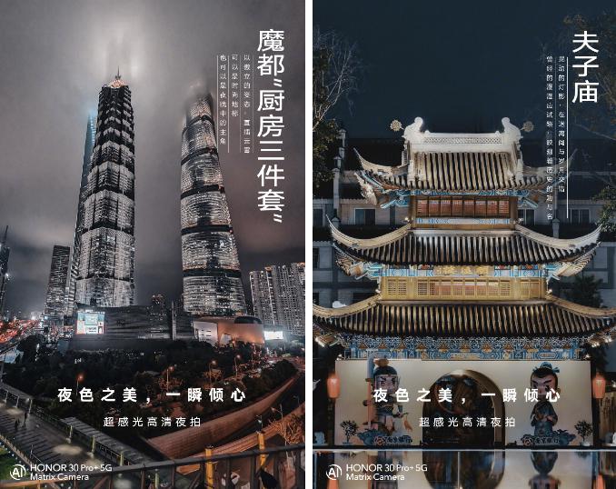 近日,荣耀30系列又发起了另外一个活动,摄影师们先后在上海、南京、乌镇、深圳、成都、厦门等不同风格的城市,对标志性建筑进行夜间“打卡”。
