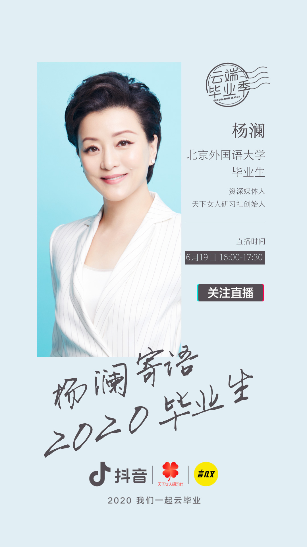 在此次的“云端毕业季”活动中,抖音也组织了各界名人校友来到直播间,与毕业生们分享青春,为他们加油打气。