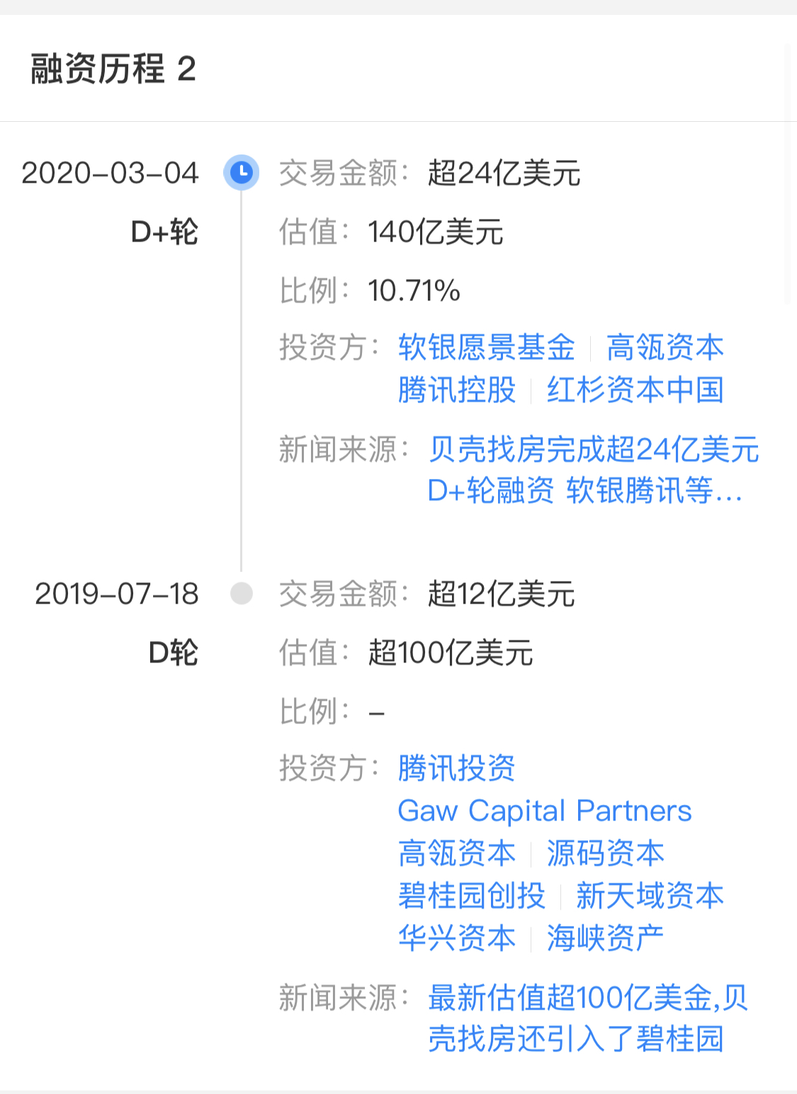 一时间,贝壳的股东阵容堪称豪华。在2019年11月完成了D+轮超24亿美元融资之后,贝壳找房的估值已经高达140亿美元。