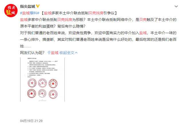 在这些全国性的大型房产中介之外,一些地方性的房产中介同样不满贝壳“多重身份”的做法。房产中介领域除了链家、我爱我家这些全国性的大型连锁企业之外,更多是一种“诸侯割据”状态,每个省市都会有当地专属的房产中介开展业务。而贝壳平台化快速扩张的势头,很大程度上威胁了这些房产中介的生存状态。所以,从去年以来包括金华、绍兴、盐城、南昌等地,也陆续出现了房产中介联合抵制贝壳的事情。