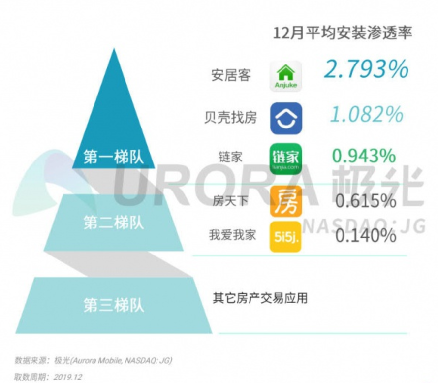 根据极光大数据发布的《城市居民置业图鉴2020》显示,截止2019年底,国内房产领域平均安装率最高的平台是安居客,渗透率为2.793%,贝壳找房次之,渗透率为1.082%。面对4000亿元规模的互联网房地产市场,贝壳找房仍要继续发力。