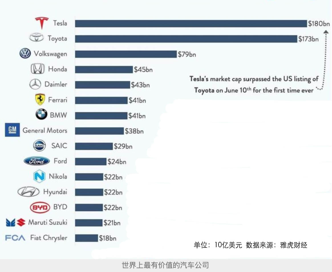 特斯拉6月份市值超越丰田后全球车企市值排名
