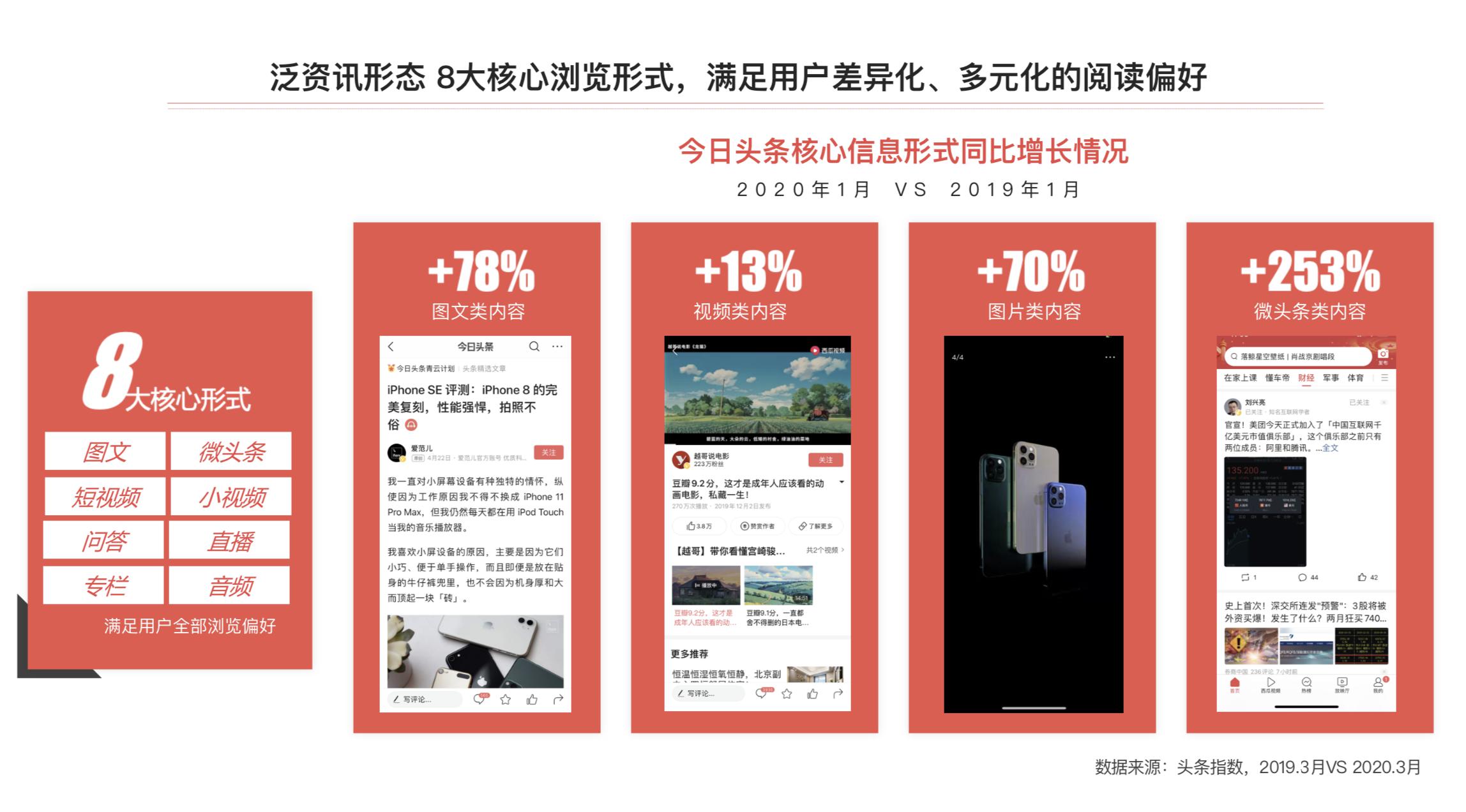 内容形态也更加多元,在泛资讯类形成8大核心浏览形式,图文、微头条、短视频、小视频、问答、直播、专栏、音频,满足用户群体差异化、多元化的阅读偏好。同时,涉及用户生活方方面面的垂直领域,健康、财经、时政、旅行、科技、汽车、时尚、美食、家居生活、公益等,可以说与用户群体工作生活相关的内容均有覆盖。