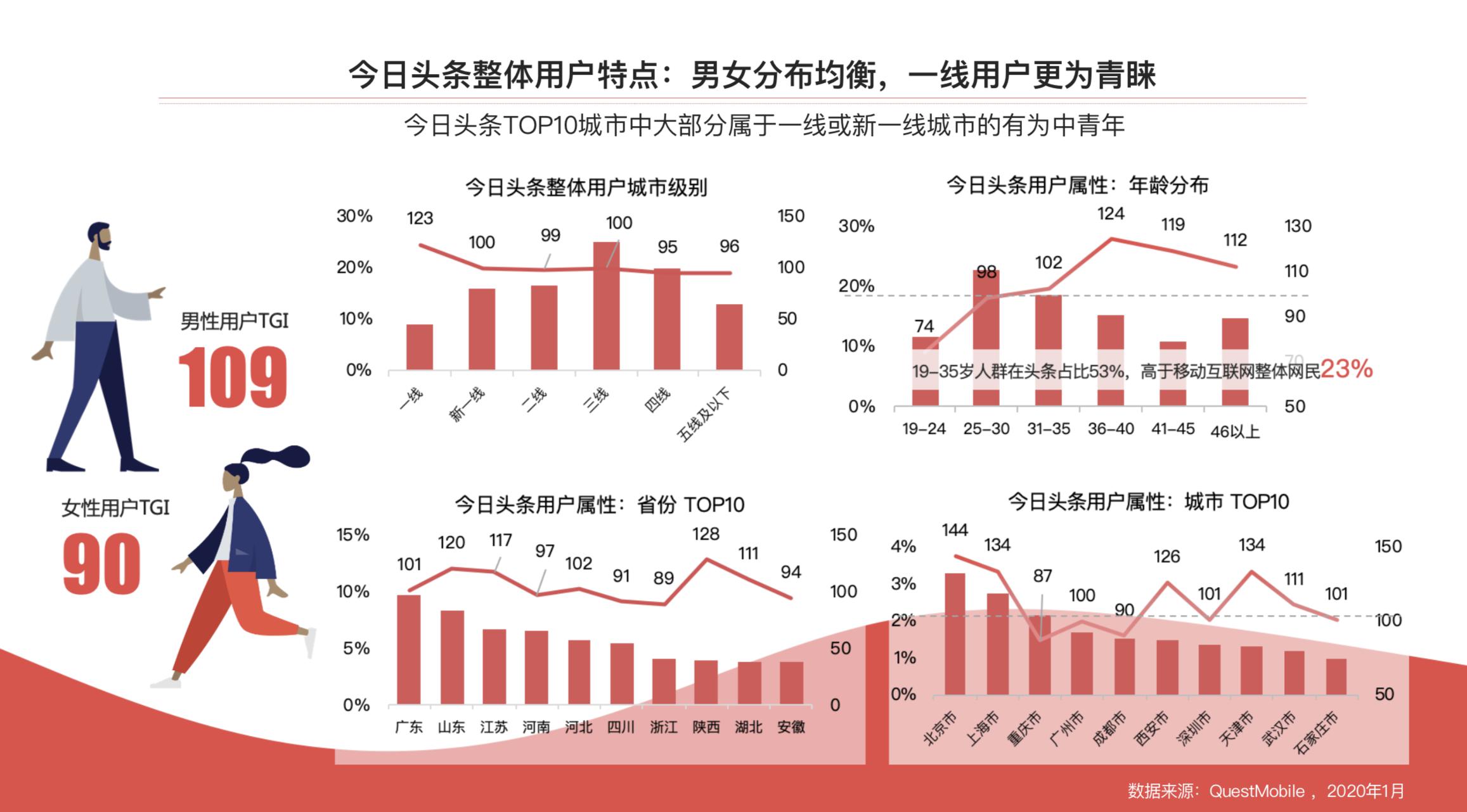 从上图中不难看出,19-45岁的用户占据了最主要的用户群体,一线到三线人群分布最多,今日头条覆盖了中国最主流的消费群体。同时,因为内容生态丰富,男女比例也相对均衡。