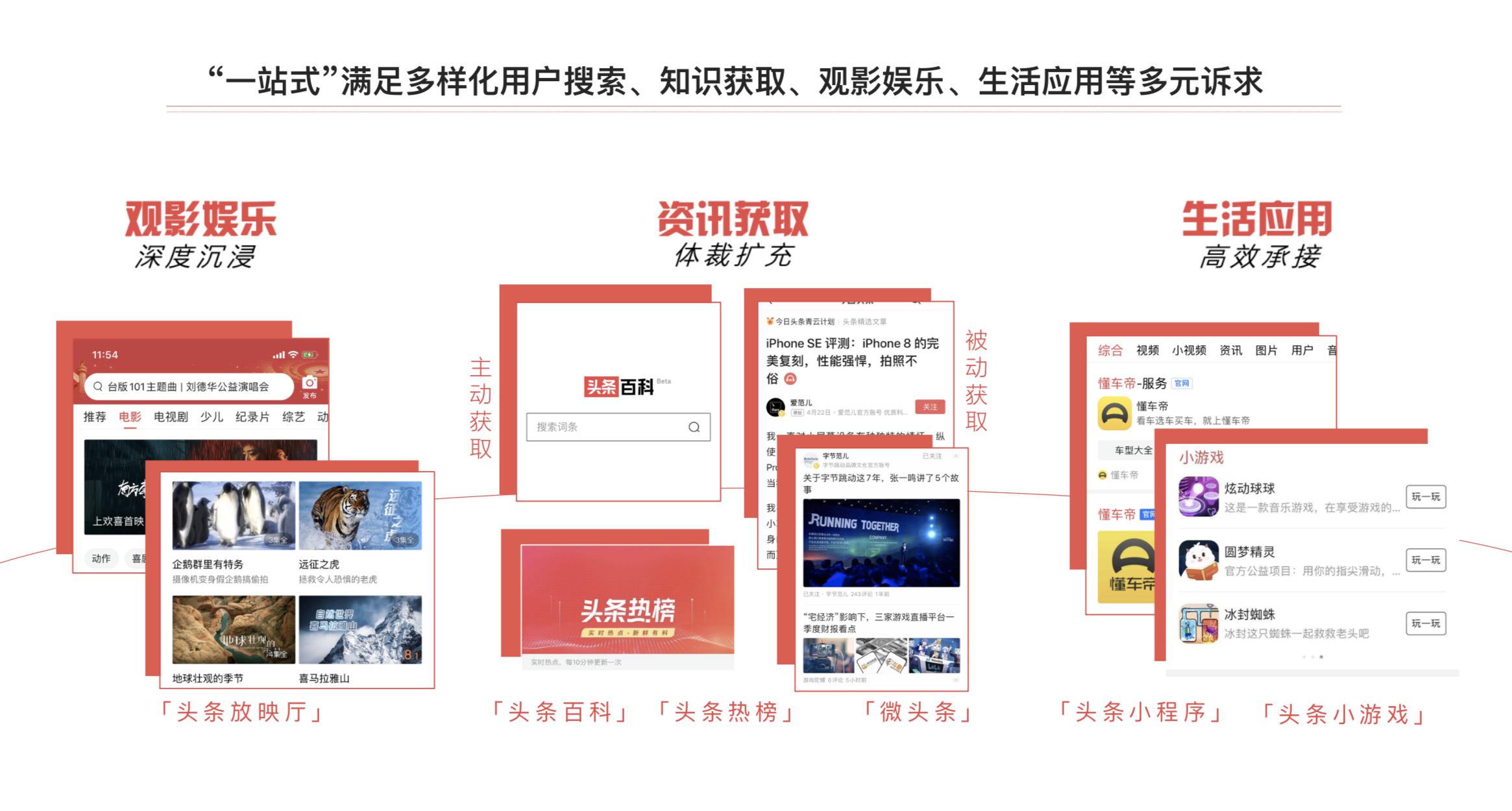 今日头条信息流推荐+搜索相结合,以被动和主动的方式高效链接用户与信息,可以一站式满足用户搜索、知识获取、观影娱乐、生活应用等多元诉求多场景信息获取的需求。