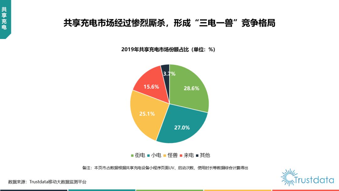 根据调研机构Trustdata发布的《2019年中国共享充电行业发展分析简报》显示,截止2019年国内共享充电宝领域的用户规模已达1.5亿人次。形成了由三电一兽(街电、小电、来电、怪兽充电)4家企业为主的市场格局,这四家的市场份额占比分别为28.6%、27%、25.1%和15.6%。
