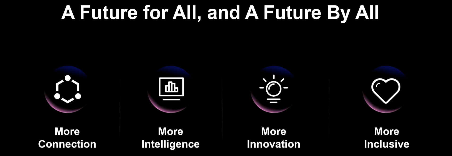 当然,改变当前的困境,需要全球所有人一起努力。陈黎芳在演讲中提到四点:更多联接,更多智能,更多创新,更多包容,“这是一个包含所有人可持续发展的未来,需要所有人共同努力。”