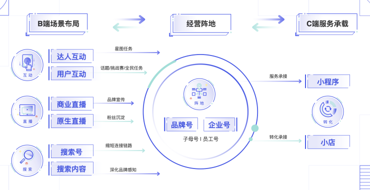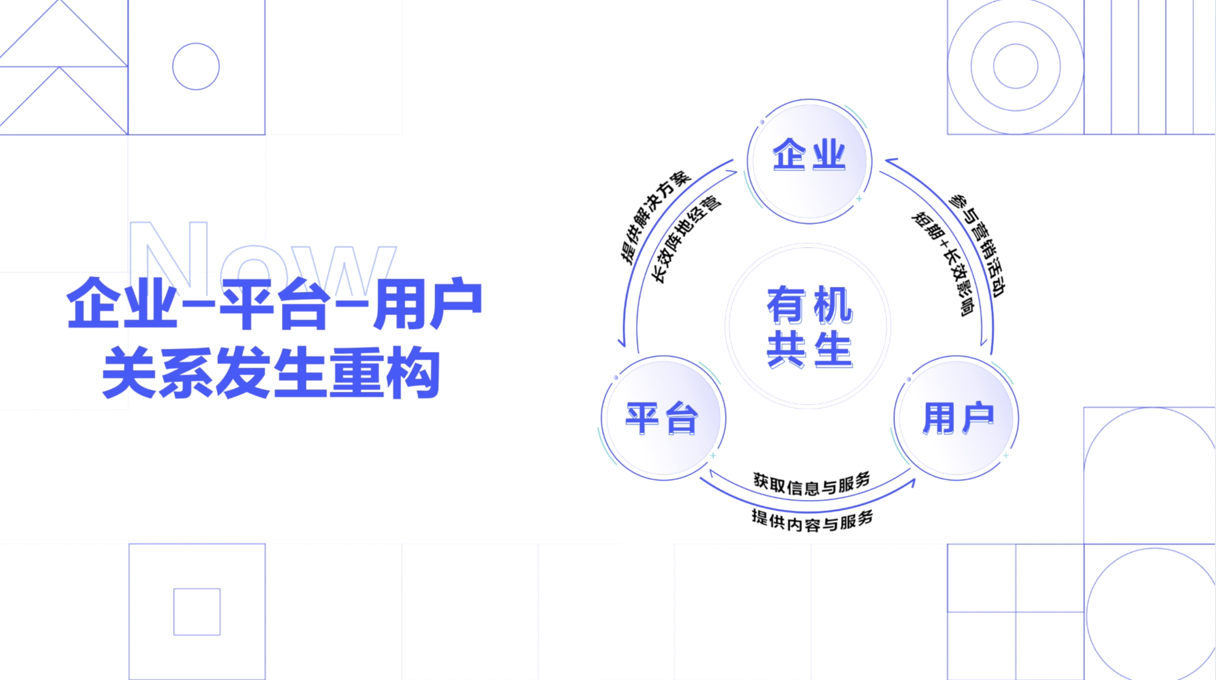 随着各类企业对数字化平台的依赖程度越来越强,你发会现平台、企业、用户之间的关系变了。以前这三者相对独立:平台提供流量,连接企业和用户,而用户和企业在其它平台或是线下产生交易。也就是说,营销和生意是两个割裂的环节。而现在,平台要帮助企业更高效地曝光信息,帮助用户接收对自己有价值的内容,平台还要提供全链路的整合服务,从品牌营销、效果转化、阵地经营、获得交易、用户管理等多个角度为企业搭建服务体系。“现在,平台、企业、用户之间形成了共生关系。”魏雯雯总结道。