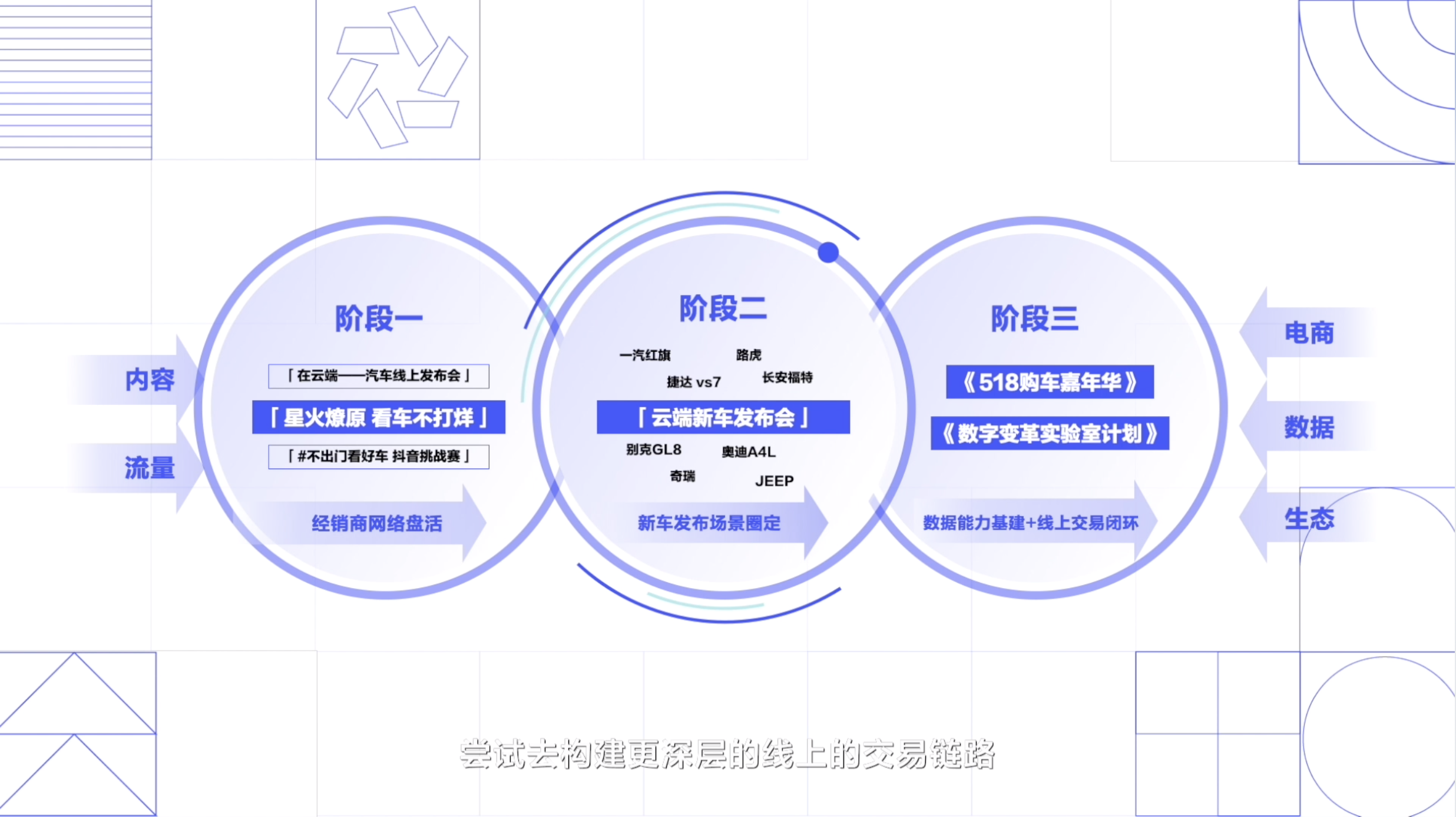在此基础上,巨量引擎平台还在快速完善两方面的能力:一是数据能力,针对性解决车企数据不通、数据运营难、归因难、变现难的问题。二是通过各个环节打通,尝试线上交易闭环,比如懂车帝的“518购车节”产生了上万条线索。