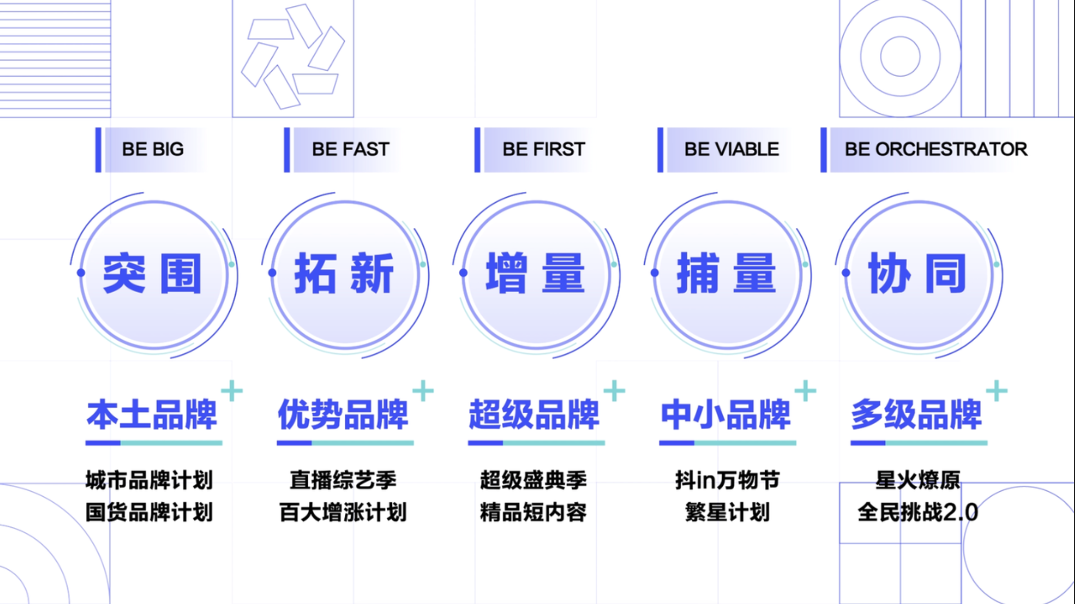 所谓生态,就是无论你是哪种类型的企业,有哪些方向的需求,总能在生态中找到适合自己的土壤。比如针对本土品牌,巨量引擎将通过以“抖inCity”和“巨量中国”为核心的“城市品牌计划” 与“国货品牌计划”助力本土品牌实现突围;针对优势品牌,巨量引擎将主推S级项目“直播综艺季”,以及“ 百大增涨计划” 进一步助力优势品牌完成拓新;针对超级品牌,巨量引擎将打造“超级盛典季”、 精品短内容,为超级品牌持续提供品牌增量,让品牌始终保持领先地位;针对中小品牌,巨量引擎将通过“抖in万物节”和“繁星计划”,助力中小品牌打造“抖音爆品”,并提升中小品牌的达人合作质量,帮助中小品牌实现捕量;针对多级品牌,巨量引擎将通过“星火燎原”和“全民挑战2.0”,实现多方联动,联手多级品牌协同发展。