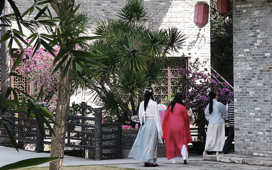 在深圳龙岗甘坑客家小镇景区,几位穿着汉服的年轻女生正站在一座明朝风格的古建筑前,时而摆出各式姿势拍摄,时而互相交流、查看照片,满脸洋溢着喜悦之情。