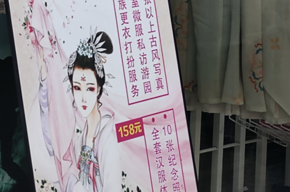 她们的汉服,租自张媛(化名)在景区附近(距离一公里)所经营的汉服商店,“两年前,我原本打算在附近开一家设计师原创服装店,但经过考察发现,经常有许多年轻女生穿着汉服在景区内拍照片,就改了思路。”