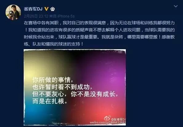 在半决赛第一场结束之后,张春军在自己的微博上写到:“在赛场中各有其职,我对自己的表现很满意,因为无论在球场和训练我都很努力!我知道我的进攻有很多的质疑声音不想去解释个人进攻问题,当球队需要我的时候我会站出来,球队赢球才是最重要。我就是块砖,哪里需要哪里搬!感谢教练、队友和懂我的球迷的支持!”