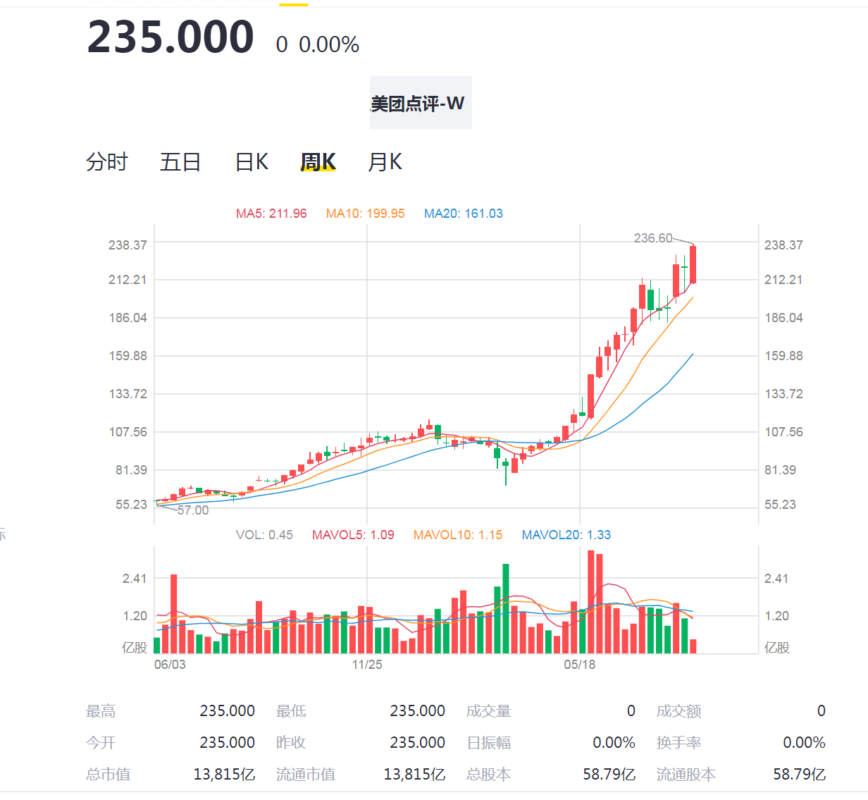 8月18日,港股美团股价大涨7.70%,收盘报235港元创历史新高,总市值达13815亿港元。