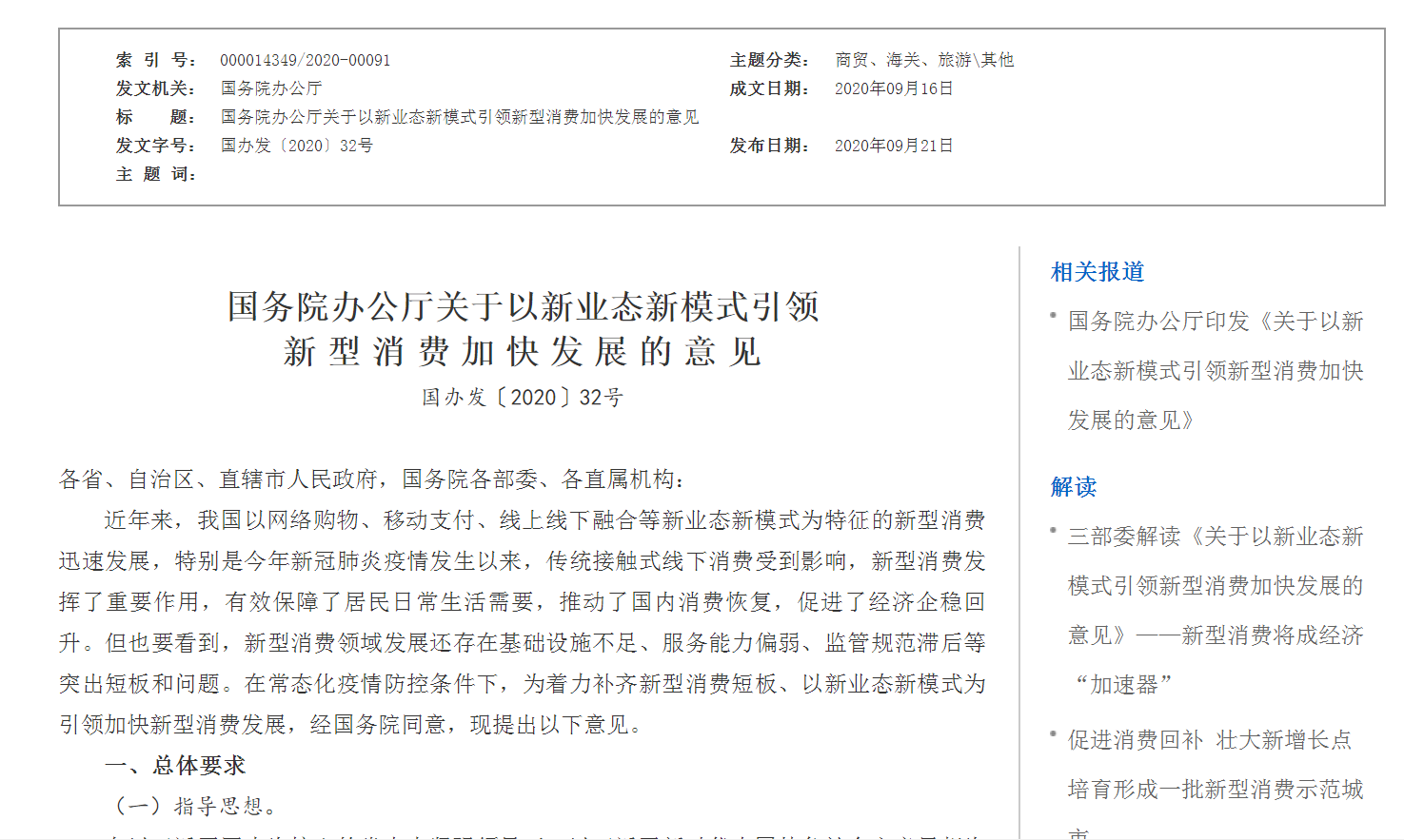 新华社北京9月21日电:国务院办公厅日前印发《关于以新业态新模式引领新型消费加快发展的意见》(以下简称《意见》)。