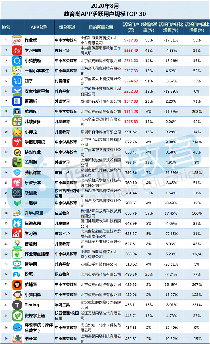 暑假期间在线教育延续了二季度常态化回落。其中“作业帮”跌出亿级应用榜,“腾讯课堂”“学习通”跌出千万级榜。