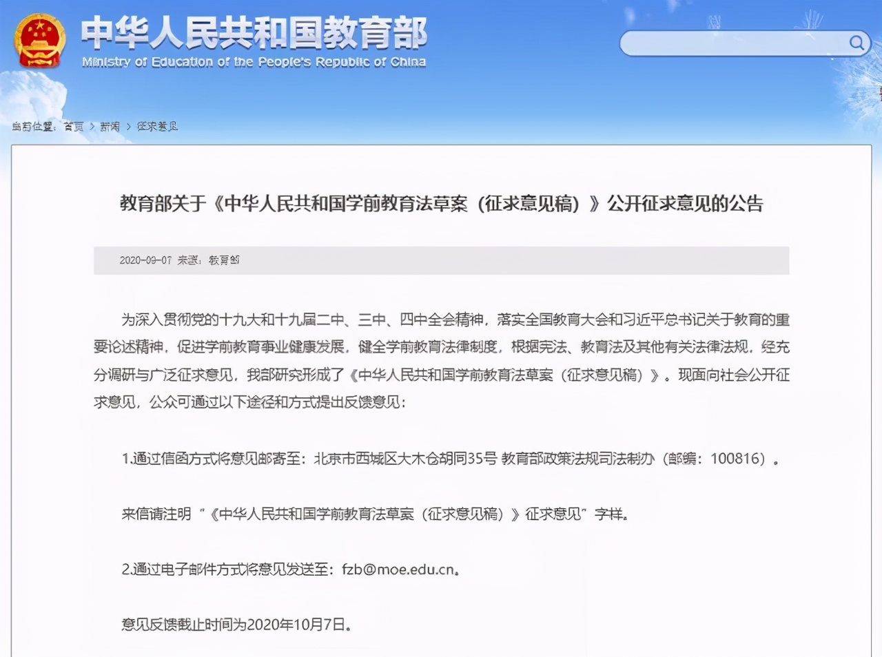 教育部9月7日起就《中华人民共和国学前教育法草案(征求意见稿)》公开征求意见。《征求意见稿》明确,幼儿园不得教授小学阶段的教育内容,不得开展违背学前儿童身心发展规律的活动。