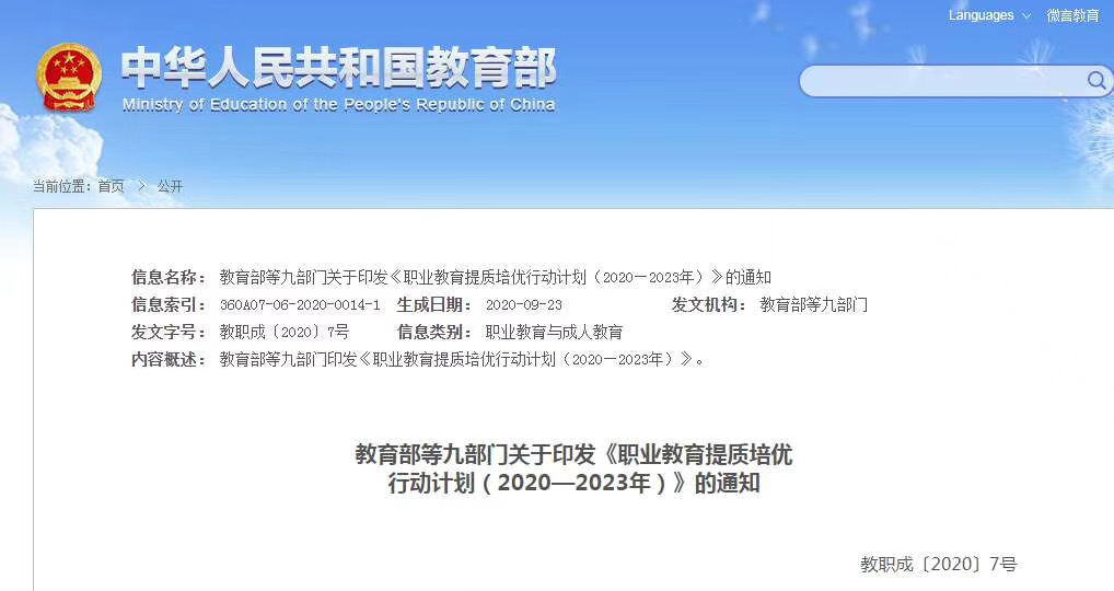 教育部等九部门关于印发《职业教育提质培优行动计划(2020—2023年)》的通知已经发布,这是近年来加大职业教育投入的最新纲领文件。