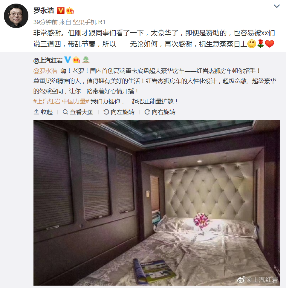 4月15日,著名“老赖”罗永浩发微博,呼吁房车企业给予赞助,以便其在接下来一年中能顺利且舒适地进行长途旅行。