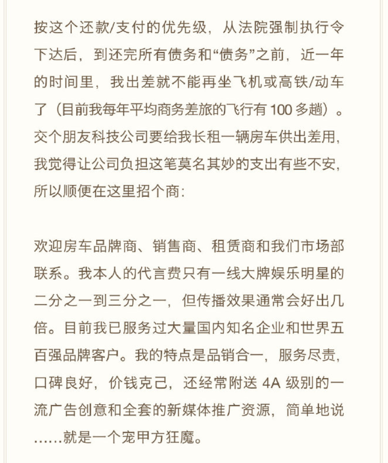 罗永浩之所以呼叫房车赞助,是因为他被列入“失信被执行人”。