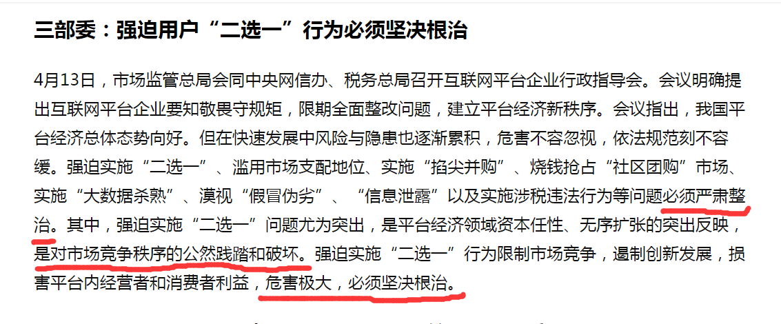 4月13日,市场监管总局会同中央网信办、税务总局召开互联网平台企业行政指导会,会议指出:我国平台经济总体态势向好。但在快速发展中风险与隐患也逐渐累积,危害不容忽视,依法规范刻不容缓。强迫实施“二选一”、滥用市场支配地位、实施“掐尖并购”、烧钱抢占“社区团购”市场、实施“大数据杀熟”、漠视“假冒伪劣”、“信息泄露”以及实施涉税违法行为等问题必须严肃整治。