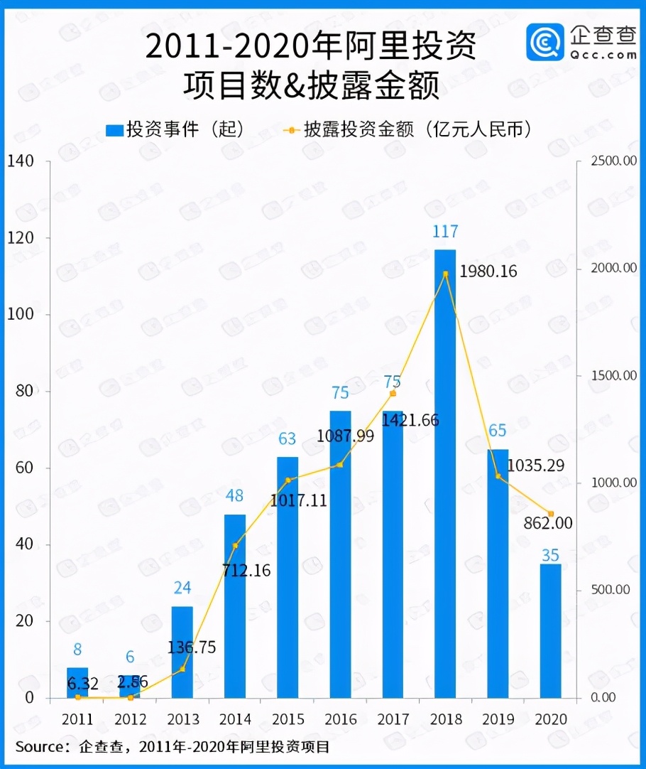 《报告》指出,在阿里巴巴投资的企业中,有97.5%的投资活动发生于2011年至2020年间,其中投资高峰期在2018年,这一年阿里对外投资了117起,投资额达1980亿元,平均每天要投出5.42亿元。