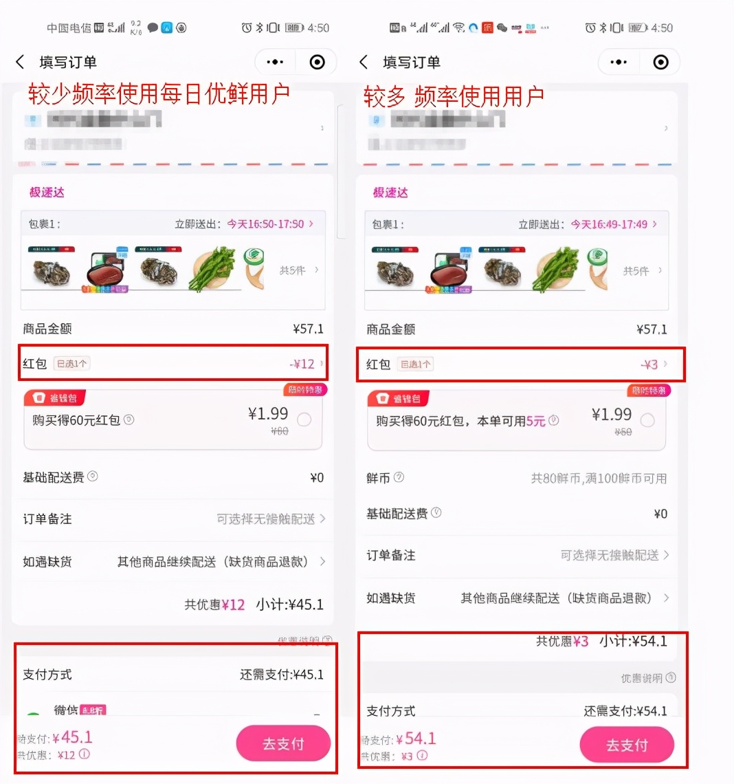 《投资者网》用使用频率不同的两个用户手机在每日优鲜上购买相同物品,两个用户获取的优惠情况确实有差异。较少频率使用每日优鲜用户(生客)可用优惠券为12元,而较多频率使用每日优鲜用户(熟客)可用优惠为3元。相较来看,熟客比生客需要多支付9元钱。