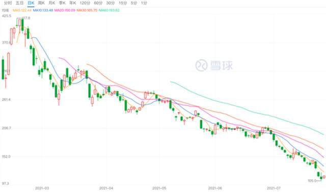 1、截止上周五(7月30日),快手的股价已经从历史最高点417.8港元/股,跌至110.1港元/股,相应市值从最高点1.738万亿港元,一路跌至4580亿港元,蒸发近1.28万亿港元。总跌幅为74%,引领了整个2021年上半年的港股跌幅。