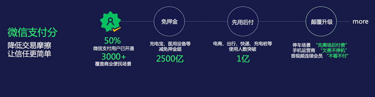 在降低交易摩擦方面,微信支付分希望让信任变得更加简单。上线至今,已经有超过50%的微信支付用户开通了微信支付分,有3000多个行业的解决方案。微信支付分与电商行业合作“先用后付”已经有超过一亿的用户在使用;微信支付分还宣布推出音视频会员“先看后付、不看不付”等服务,助力解决困扰音视频用户提前扣费、忘记解约等问题。