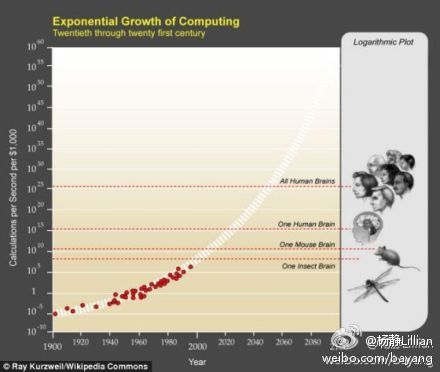 谷歌专家雷.库兹韦尔对未来计算机智能增长曲线的预测图