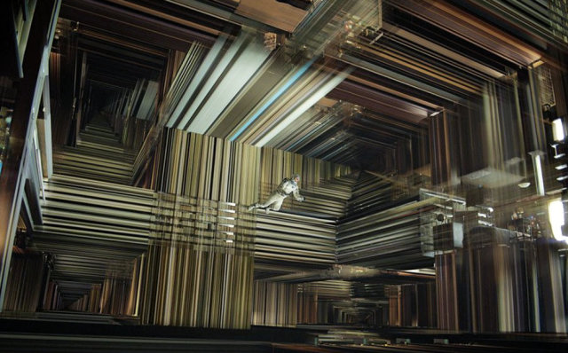 在黑洞当中,他先是勇敢,后是惊恐地坠落、坠落,最后坠入了五维空间。在这里,时间像无穷的正方体,交错罗列在他的视线中。在无穷的时间里,他依然一眼就看到了第一个层次的自然的“我们”,他看到了女儿的书架,在生死关头,在“我们家”和“我们人类”之间,他也是首先选择了“我们家”。不相信这个大英雄会这样么?他惶恐地在书架中推下了“STAY”。试想,如果在时间隧道那头的过去的“库珀”选择了“STAY”,那么人类的“永恒号”就无法登上此次征程,这个选择其实与曼恩一样怯懦。好在,过去的那个库珀,拒绝了处于黑洞中临死挣扎的“库珀”的“原始我”,而是走向了航天局的“永恒号”。