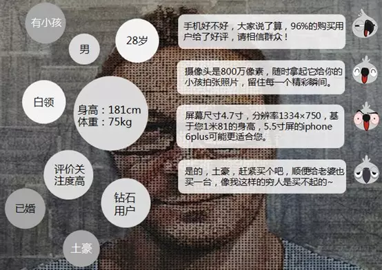 JIMI会根据用户的数据给他打上各种标签,然后针对他的特性推荐相应的服务,比如1,评价关注度高,2,有小孩,3,身高,4,土豪,已婚等特性给用户推荐不同的产品和服务。总之一招不管用会来另外一招。