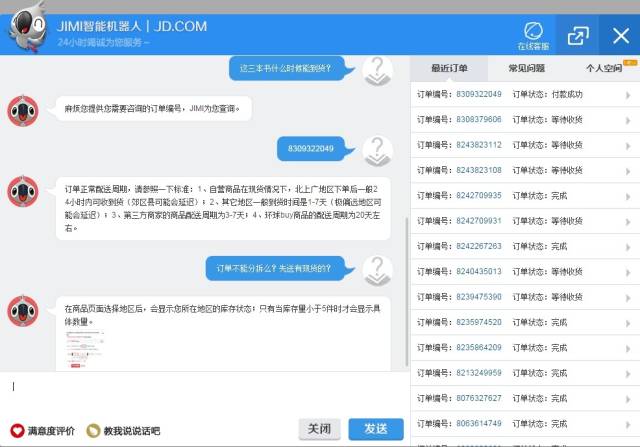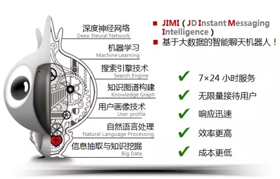 我上面提了很多次JIMI,那么谁是JIMI呢?对了,就是我们JDInstant Messaging Intelligence 的缩写。是一个基于大数据的智能聊天机器人,它可以一个星期7天,每天24小时提供服务,可以无限量的接待用户,它比人工响应更加迅速,效率更高,而且成本更低。