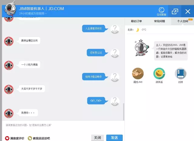 还有一个关于JIMI的故事:有一次JIMI在网上被吐槽和投诉,原因是别人说它骂人了。其实之前我们教育过 JIMI要讲礼貌,不要骂人的,所以就去了解是怎么回事,后来发现,不是JIMI骂人,是别人骂它,它回了一句彼此彼此。当然,再后来,它又学乖了,不管别人怎么骂他,调戏它,它也能做到骂不还嘴,它只会说一句话:对不起,没有解决您的问题,我下次一定改进。