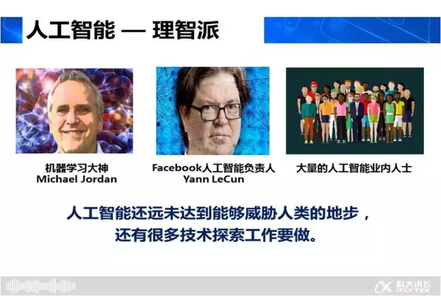 而另外一些科学家,我们可以叫他们理智派。例如Facebook人工智能方面的负责人Yann LeCun,估计和我们今天在座的想的差不多。他们认为人工智能远未达到威胁人类的地步,还有很多工作要做。如果在公司干过,就会发现老板和下面做事的人想法是不一样的,老板们都比较乐观,认为什么都能够实现,就像前面的盖茨和马斯克。而工程师会证明有这样那样的限制,还有很多的难度。老板都是乐观威胁派,工程师都是理智派。