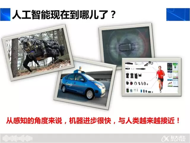 第二方面,如果从感知的角度讲,举个例子,一个动物,一只猫或者一只狗,看到周围会避让。随着传感器、图像、语音识别技术不断进步,还有基于各种传感器综合的自动驾驶汽车出来了以后,在感知智能这个领域,计算机进步是非常快的,与人类的能力也已经是非常接近了。