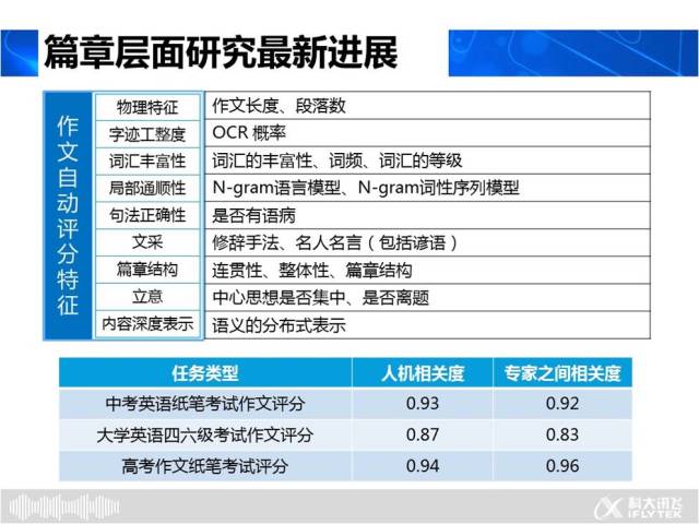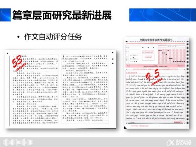 自动批改作文需要很多的信息,远比刚才的复杂得多,包括作文长度,句法正确性,词汇的丰富程度等等信息,各方面的。我们现在能够做到在英语四六级和高考作文里面跟人类专家相接近的水平,这些都展示了我们在自然语言处理方面的最新进展。