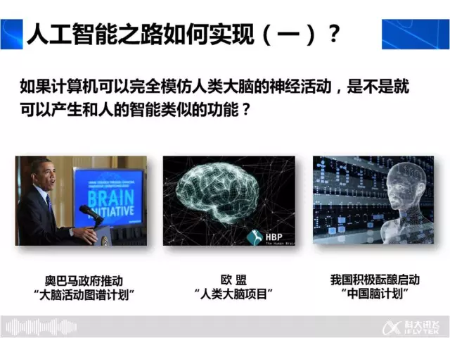 下面我们来看第二个问题,How,我们如何才能实现人工智能的突破?有人相信我们通过对大脑工作原理的模仿能够实现超级智能。最近国际上很热的就是各个国家的人工大脑模拟计划。过去的十几年,美国在人类基因图谱里面投入38亿美金,现在奥巴马政府号称要用40亿美金来推动人脑图谱计划。另外欧洲也在推进人脑模拟的计划,他们的目的主要是研究人脑本身的问题,但是后面加了一个尾巴,讲我们如果搞清楚了人脑如何运作,人工智能问题也能够解决。我知道最近的中国的脑计划里面,也是把生命的脑和人工智能脑,就是放在一起。前面讲的不可忽略的事实,现在我们使用的神经网络和脑神经的工作原理基本没有关系,只是结构上略有模仿。如果从仿生的角度讲是最浅层的仿生,工作算法和人脑神经元的工作机理没有什么联系的。