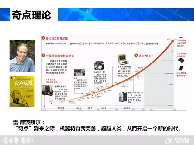 到底人工智能会不会威胁到人类呢,很多人都认为关键要看是不是在技术的发展上存在“奇点”。雷.库兹韦尔去年来到中国,他的奇点理论去年非常热,不管是摩尔定律还是超摩尔定律,我们注意到如果没有量变到质变而产生的“奇点”,计算机要想超越人很难。那么我们就在想,大家都在讨论人工智能的奇点问题,那人类智能的发展在历史上是不是也存在奇点呢?