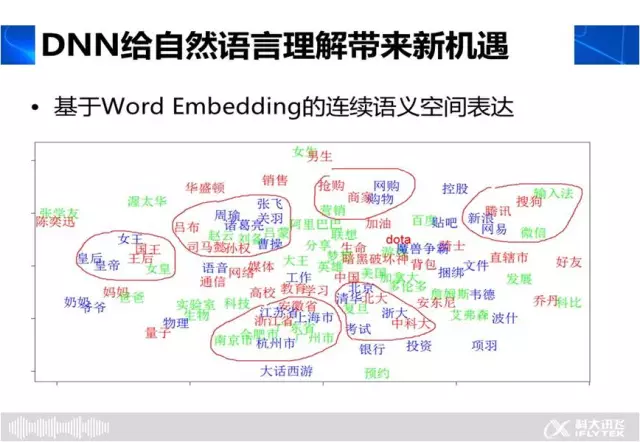 首先是用了神经网络以后,我们能够取得什么样的新成果呢?现在把我们的词语的概念表示从原来是离散的分布表示成连续的分布,并且是用地图的可视化方式表现出来,词语之间的距离可以度量了。