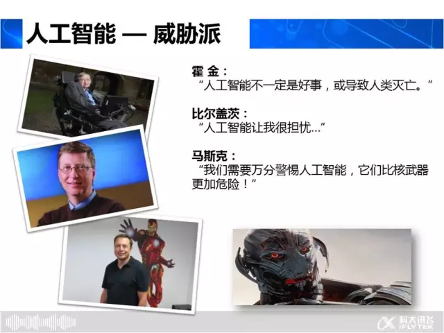 When就是说什么时候人工智能能够真正的实现革命性的突破。在这个问题上有两派的观点,大家(前面都)提到了,我就长话短说。霍金,马斯克,比尔盖茨,他们认为人工智能很危险,我们需要警惕。可以看出他们是非常乐观的,而且认为人工智能有危险。我们可以叫他们威胁派。