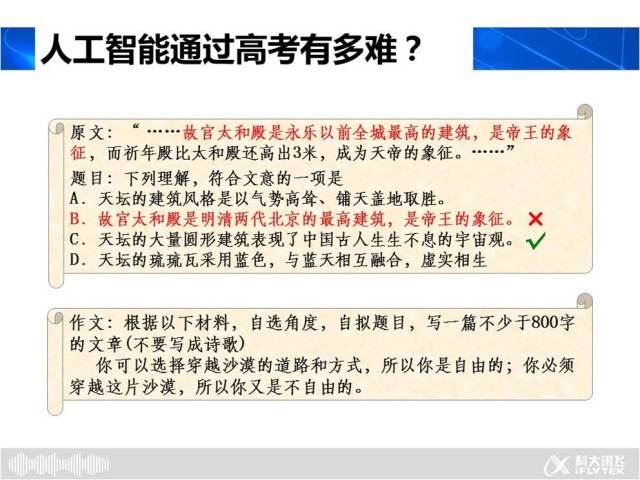可能大家还没有概念。举个例子看一下,这道题说了祈年殿的高度是多少,提到了历史字眼,和朝代有关系,判断下面哪一个说法是对的,按照这个说法得理解这个朝代和历史之间的关系才能作出正确的判断,这不是传统的神经网络直接套用就可以得到的。更难的是读一段话以后,在自由和不自由的哲学问题上要写篇作文,这个挑战会更大。