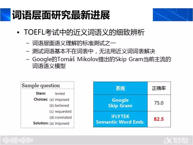 我们可以看到第一个进展是在托福考试里面的近义词选择问题。这里需要用到语义的分析。左边的表有很多的词,我们需要找到含义最接近的一个。大家觉得就简单的搞一个近义词表就可以了,实际做的时候是没有近义词表的,是靠词和周边环境的距离来度量的。