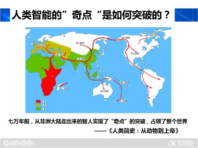最近我在看一本书,叫做《人类简史:从动物到上帝》,这是一个以色列的年轻历史学家写的,最近很热。这里面说到,两百万年之前就在世界各地方有古人类了,欧洲、非洲、亚洲、美洲都有。在我们中国的古猿人有山顶洞人,元谋人等。最近的考古证明,现在世界上所有的人类都来自于非洲的智人,中国古猿人属于直立人。7万年前的时候,从非洲来的智人走到世界各地,他们把其他地方所有的猿人都给灭了。当时世界上有六种主要的古猿人,但是智人把大家灭了。200万年的过程中相安无事,7万年的时候给灭了,说明了那个时候人类智能是有一个“奇点“的。这个突然到来的事件,也给神创论的争辩等提供了一些考古上的佐证。