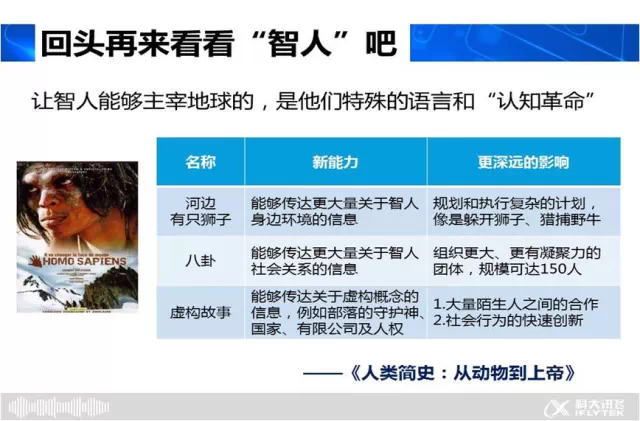 为什么这样说呢,再回头看一下智人,7万年前智人干掉了其他的五种猿人。后来有人研究为什么智人能够把其他人干掉,他们定义了一个概念,认知革命。人类历史上先有认知革命,然后才有农业革命,工业革命,信息革命,第一是认知革命。这个表非常有意思。有了语言以后,对智人有很深的影响。河边有一个狮子,事实证明猴子也能发出这个声音,但是智人发出的要复杂得多,能够更好的了解自己周边的环境。还有一个很重要的能力就是八卦,大家知道女人的八卦能力比男人强,这对人类社会非常重要的。因为这可以帮助建立复杂人际关系,使原来50人以下的团队协作规模可以达到150人,1500人。最重要的是大家提到的,因为有了这些语言和知识以后,让智人产生了很多想象出来的东西,比如说宗教,大家可以交流了。正是因为有了这些秘密武器,人类有认知的革命以后,才实现了“奇点”的突破。问题就是这样的,人工智能是不是也会有,也需要有认知革命。现在大家讨论比较多的还是人工智能是和人交流,那么人工智能自身之间要形成联系,有突破的话,他们之间怎么进行交流,怎么样才能产生他们的社会和宗教,他们也要有认知革命。