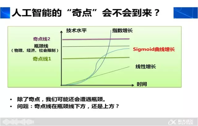 我们回头看一下,其实这个“奇点”是很难预测的。真正的问题是在什么地方,如果我们相信所有的事物发展都是指数曲线的话,我们群里面其实有一个讨论的笑话,如果真的所有事情都按指数曲线来发展,飞机发展到现在装几万吨货应该都没有问题,汽车发展到现在只用一克油就可以跑一百公里,但是事实是没有。所以科技的发展还有很多其他的限制,限制是有瓶颈线的。这些瓶颈线受限于物理、经济和社会的限制。有可能技术的发展遵循的是Sigmoid曲线。做模式识别的人都知道,Sigmoid曲线前面跑的比指数曲线还快,最后还是会被限制住。我们不知道现在技术的发展是遵循指数曲线还是Sigmoid曲线。那么问题就来了,“奇点”会是在瓶颈线之前达到还是之后达到,这个事情我认为讨论太多是没有意义的,因为很难说清楚,我们只管做就行了,我们的目标就是不断推动技术的进步。