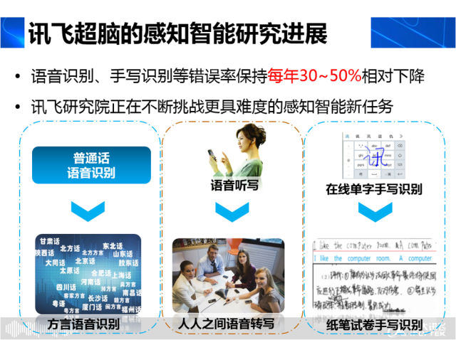 在感知智能方面,我们最近不断取得了最新的进展,语音识别和手写识别方面的效果不断提升。像刚才几位老师说的,不管是图像识别还是语音识别方面,最近这几年系统的错误率是连年的下降,性能是不断提高。原来语音识别普通话很好,现在已经有二十多种方言也能够识别。原来能够很好的识别人和机器之间的语音对话,这种情况下人的讲话是比较标准的。而几个人进行自由讨论,说话的自由度非常大,现在也可以很好的识别出来。在图像识别方面,从原来的手写识别,到现在考卷上潦草的离线字迹也处理得很好。这些方面的进展,我们是围绕任务和功能做的,替代了原来人类很多感知方面的工作,降低了人类这方面的工作强度。