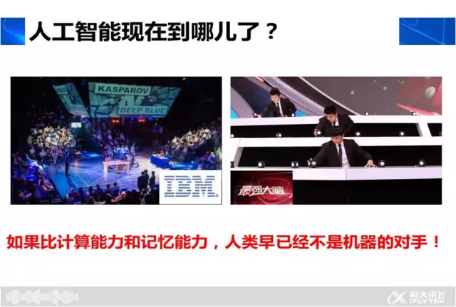 还有一个问题需要回答,就是Where,人工智能发展到哪儿了?人工智能是一个广泛的概念,不能用一个点表示,1到N不同的方向的状态是不一样的。如果跟计算机比计算,比记忆,人类已经没有比的意义了。1996年IBM的深蓝计算机战胜了当时的国际象棋冠军卡斯帕罗夫。不知道在座的多少人知道现在我们人是怎么跟计算机比赛下象棋的。现在人类选手可以用一个笔记本弥补了计算和记忆的缺失,这样人类还是可以战胜电脑的,因为人类具有创新的能力。大家知道江苏卫视的一个节目,最强大脑。其中一个很有意思的,一百组4粒骰子,摇出100个四位数组合,由两个人类选手去记忆,比谁的记忆力强。这对计算机来讲不是事,这个方面就没有必要比了。计算智能方面计算机已经远远超过人类了。